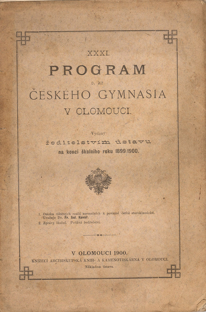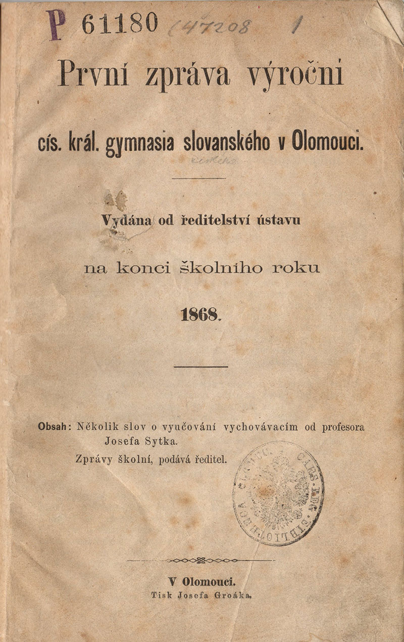 V době svého založení (1. října 1867) bylo Slovanské gymnázium jedinou střední školou s českým vyučovacím jazykem na střední a severní Moravě. Díky jasné koncepci i kvalitní práci a nadšení profesorského sboru vyrostlo Slovanské gymnázium z nesmírně skromných podmínek v elitní centrum vzdělanosti a českého vlasteneckého života. V té době suplovalo v Olomouci dosud absentující univerzitu. První maturity na Slovanském gymnáziu se uskutečnily v roce 1872 za přítomnosti panovníka císaře Františka Josefa I.